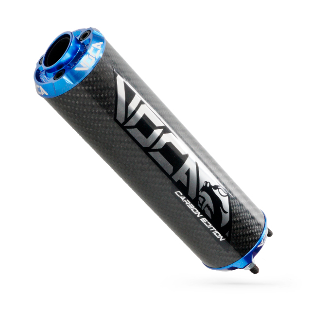 The VOCA Carbon silencer is made of 100% real carbon and the CNC anodised aluminium end caps are available in multiple colours so you can match them to your bike.